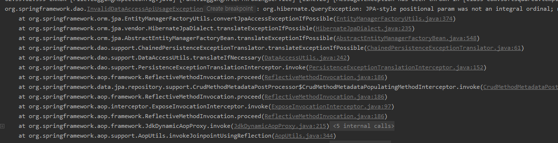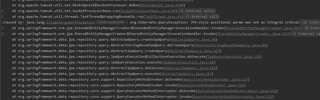 대충 읽어보면, `JPA-style positional param was not an integral ordinal` 이 원인이라고 한다.