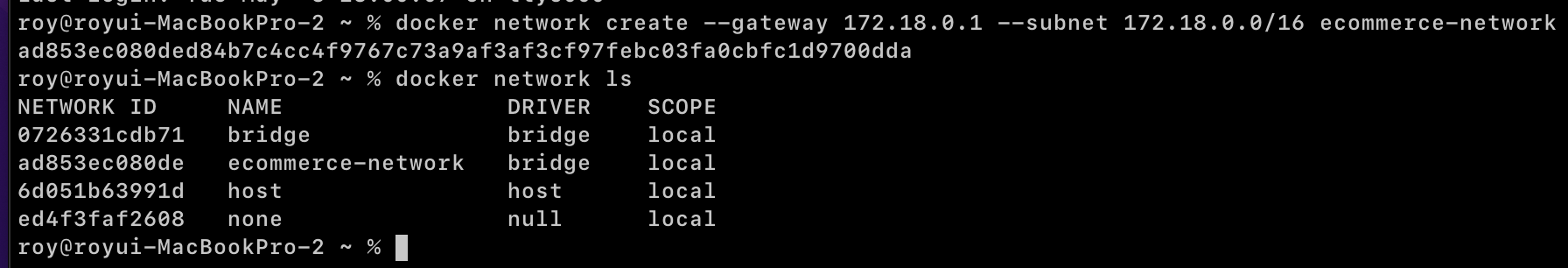 $ docker network create --gateway 172.18.0.1 --subnet 172.18.0.0/16 ecommerce-network