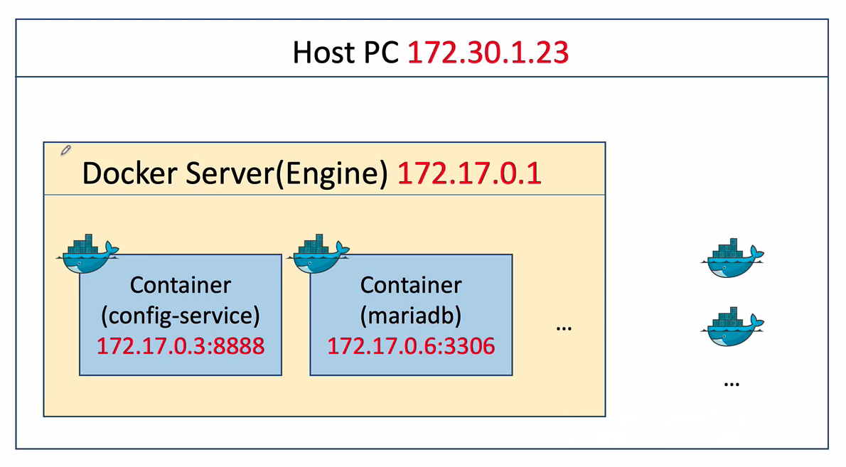 도커 컨테이너에서 실행되기 전에는 동일한 PC에서 실행되어 같은 내부 IP 대역폭에서 실행되어 내부 IP로 통신할 수 있었다. 하지만 도커의 경우 가상화된 머신이며 설정없이는 같은 망으로 인식하지 못하기 때문에 내부 IP로 통신할 수 없다.