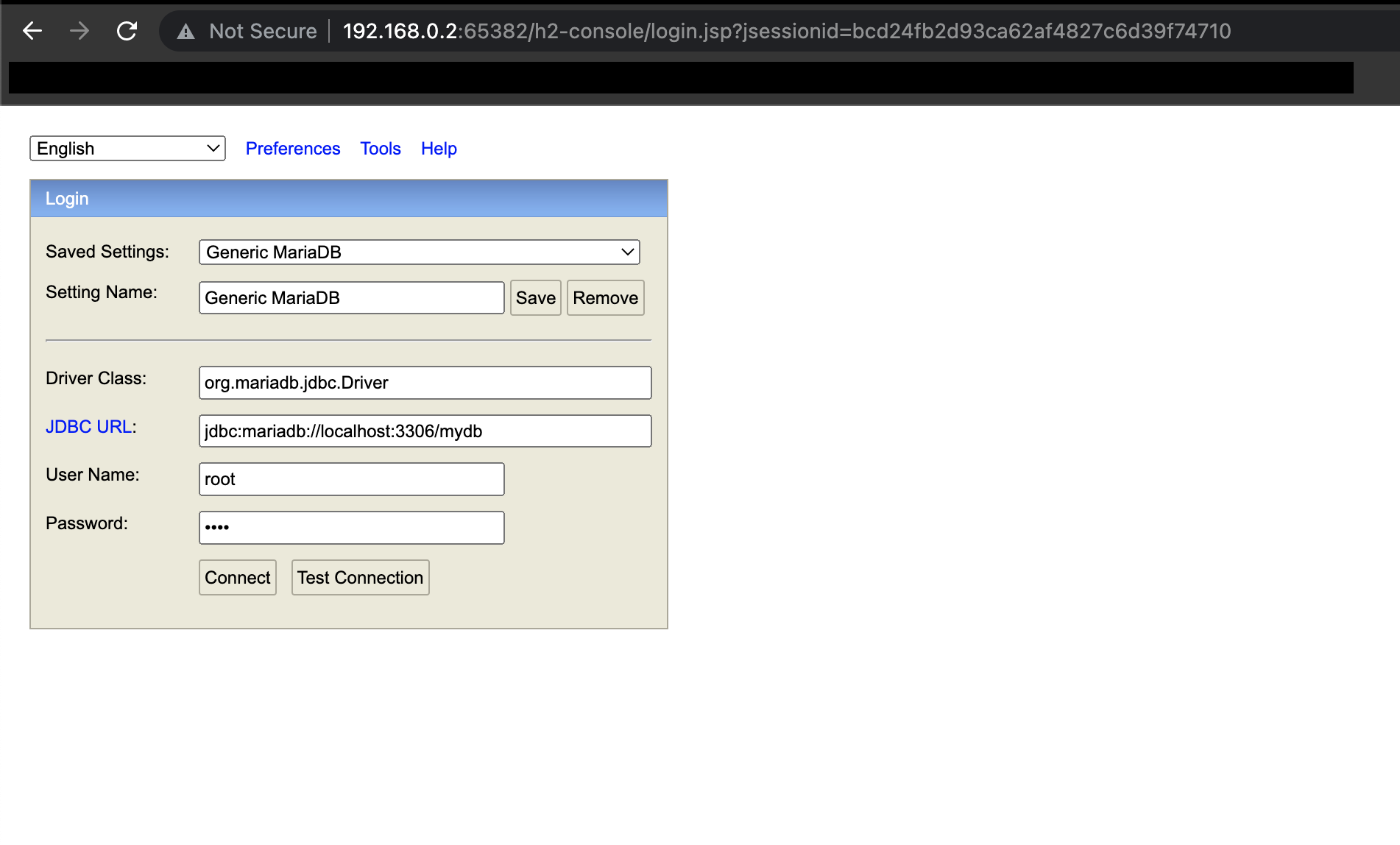 이름은 h2-console이지만 우리는 이제 h2-console을 통해서 MariaDB에 접속할 것이다. 아래의 이미지와 같이 설정값을 수정한다. 비밀번호는 각자 설정한 비밀번호를 입력한다.